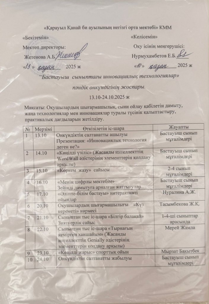 "Бастауыш сыныптағы инновациялық техналогиялар" пәндік он күндігінің жоспары.