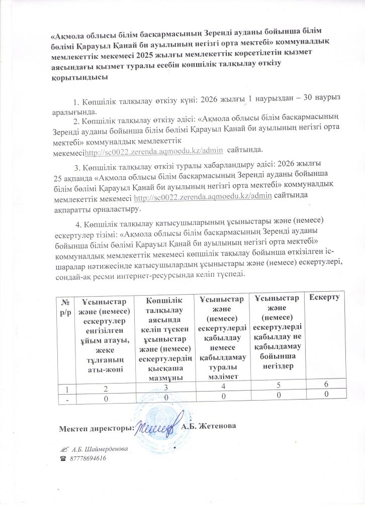 «Ақмола облысы білім басқармасының Зеренді ауданы бойынша білім бөлімі Қарауыл Қанай би ауылының негізгі орта мектебі» коммуналдық мемлекеттік мекемесі 2025 жылғы мемлекеттік көрсетілетін қызмет аясындағы қызмет туралы есебін көпшілік талқылау өткізу қорытындысы
