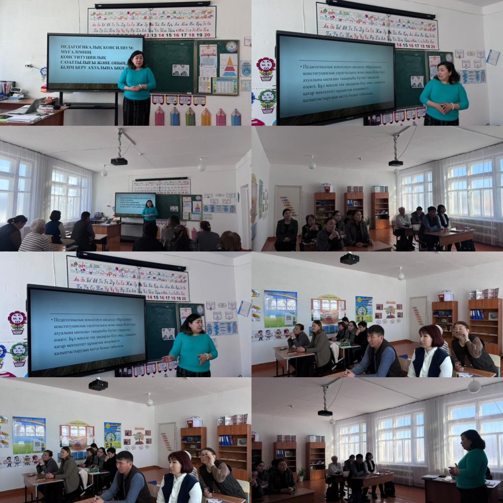 Зеренді ауданы, Қарауыл Қанай би ауылының негізгі орта мектебінің директоры Жетенова Арайлым Балтакескенқызы мектеп ұжымына конституциялық нормаларды түсіндіріп, ақпарат...